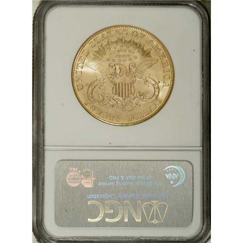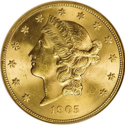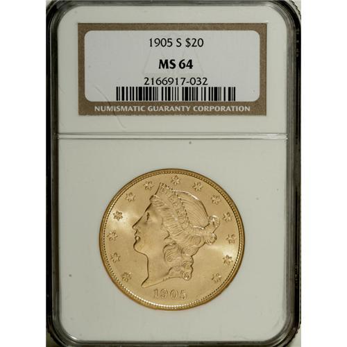 <B>1905-S $20 MS64 NGC.</B></I> A deceptively difficult issue with a mintage of more than 1.8 million pieces. This is a particularly pleasing example that has bright, coruscating mint luster. The coin has even, bright orange-gold color with no hints of other color apparent. Sharply struck and refreshingly free from abrasions. This upper-end coin is as close as one can reasonably expect to an actual MS65.<BR><BR><b>Shipping:</b> Coins & Currency (<a target="_blank" href="http://www.heritageauctions.com/common/shipping.php">view shipping information</a>)