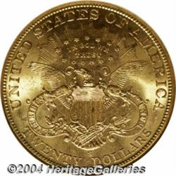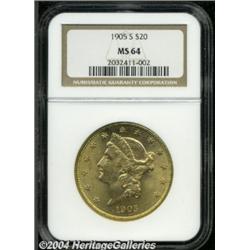 <B>1905-S<$20> MS64 NGC.</B></I> A lovely honey-gold type coin with a beautifully preserved reverse and a clean obverse. This well struck and frosty near-Gem is worthy of the finest advanced cabinet, and is virtually unobtainable any finer. Population: 82 in 64, 4 finer (5/04). <BR><BR><B>Important notice:</B> Heritage usually auctions material at the rate of 200-250 lots per hour. On some occasions eBay Live bid software or the Internet may not be able to keep up with the pace of the auction. We recommend placing a realistic absentee bid now as insurance to avoid disappointment. Occasionally the auctioneer may eliminate or reject an eBay Live bid, and the auctioneer may also reopen a lot after the close of the eBay live bidding (usually because we missed an audience bid), and may reject your bid even if it shows you as the winning bidder. By bidding via eBay Live, you agree that Heritage may award the lot to another bidder at its sole discretion under the circumstances described above or any other reasonable circumstances. Since eBay bids are not shown to us until we open the lot on the floor, we treat those bids just like floor bids. In most cases the floor responds before the eBay bid is presented to us, due to Internet lag time, so for consistency we have made it a policy that floor bids are always considered first over tie eBay live bids. Also please note that all Heritage lots purchased through eBay Live carry a 20% Buyer's Premium. Please make sure you read the Terms and Conditions before you bid. </span></font></tr></table></td></tr></table>