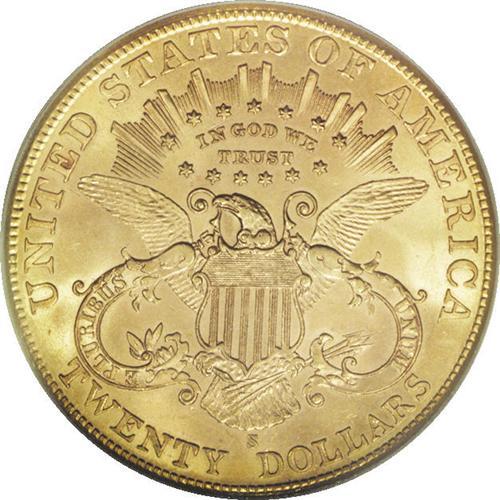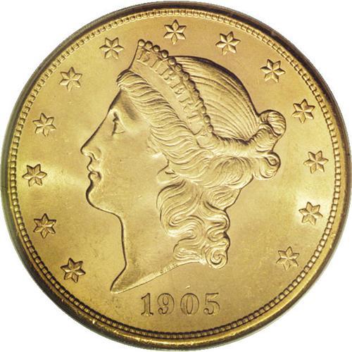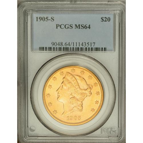 <B>1905-S $20 MS64 PCGS.</B></I> Although available in lower Mint State grades, the 1905-S is considered a better date once it reaches the Select level of preservation. This piece is nicer still, of course, and indeed appears to be blessed with a lower than average number of surface abrasions for the grade. Peach-gold in color, the coin possesses an attractive satiny luster and shows just the merest hint of a mirrored surface on the reverse. Population: 125 in 64, 7 finer (11/06).<BR><I>From The Kutasi Collection.</B></I><BR><BR><b>Shipping:</b> Coin/Currency (<a target="_blank" href="http://www.heritageauctions.com/common/shipping.php">view shipping information</a>)