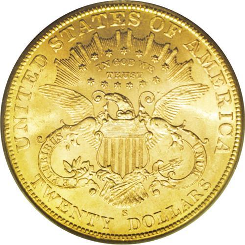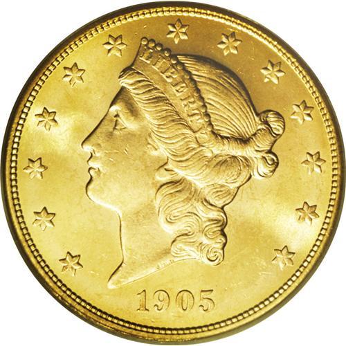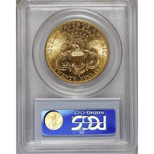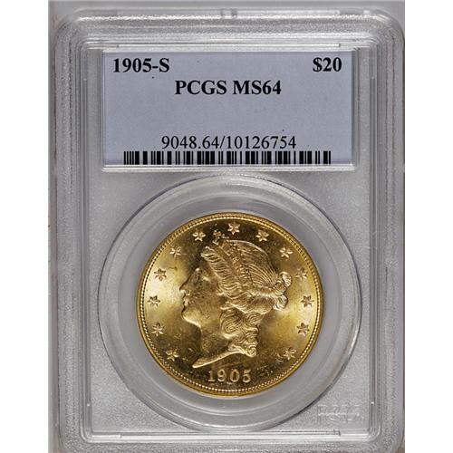 <B>1905-S<$20> MS64 PCGS.</B></I> Dazzling luster and color, being held back from Gem status by minor contact marks in the obverse fields. This generally well produced issue is seen far less often in Mint State than more than a dozen of its S-mint predecessors. Population: 129 in 64, only 7 are finer (7/06).
