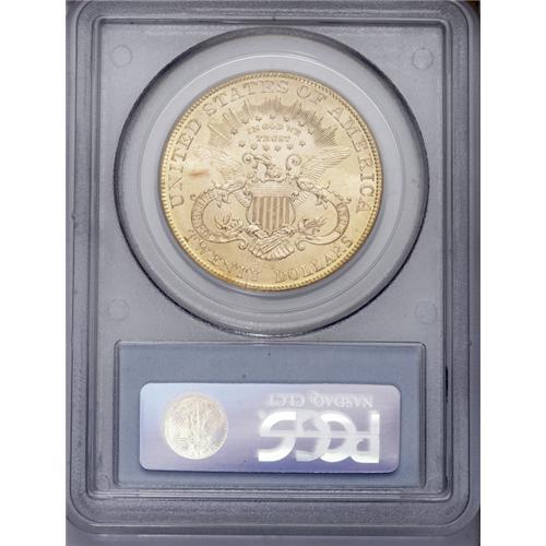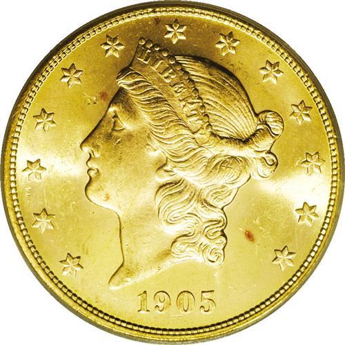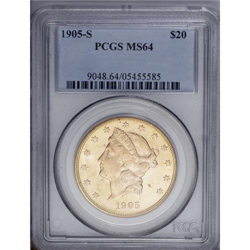 <B>1905-S $20 MS64 PCGS.</B></I> Even though 1.8 million pieces were struck of the 1905-S, it still stands as the scarcest S-mint Liberty twenty dollar produced after 1890. It is a rare find in MS64. The devices are very sharply (we are tempted to even say 'fully') struck and the bright mint luster has taken on an even reddish-golden hue that is most attractive. A few field marks account for the less-than-Gem grade. Population: 126 in 64, 7 finer (1/06).