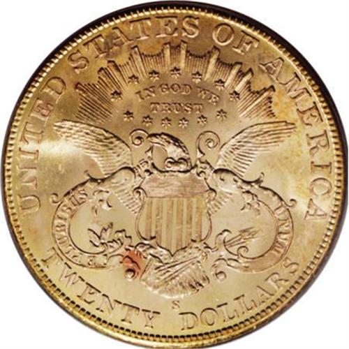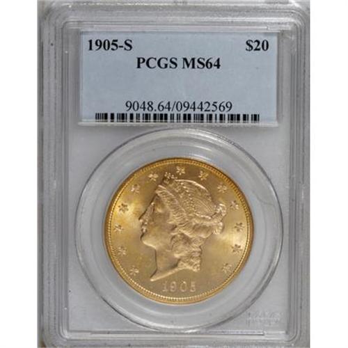 <B>1905-S $20 MS64 PCGS.</B></I> Despite a mintage of over 1.8 million pieces, the 1905-S presents a challenge in better Mint State grades; Garrett and Guth (2006) describes the issue as "quite scarce" in Choice, with examples of higher quality "rarely seen." This shining near-Gem displays vibrant luster and minimally marked wheat-gold surfaces with vivid sun-yellow accents. The crisply detailed portrait is particularly clean. PCGS has graded only seven finer pieces (8/07).<BR><BR><B>Coin Engraver:</B> James B. Longacre<BR><BR><b>Shipping:</b> Coins & Currency (<a target="_blank" href="http://www.heritageauctions.com/common/shipping.php">view shipping information</a>)