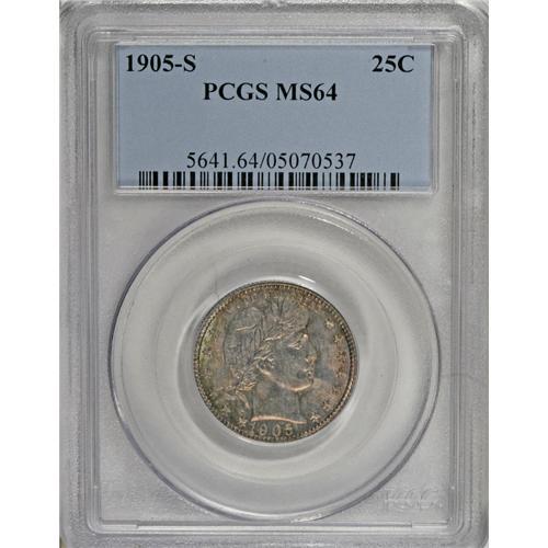 <B>1905-S 25C MS64 PCGS.</B></I> Deep plum, golden-brown, and apple-green toning embraces this lustrous and well preserved near-Gem. A few vertical roller marks on the cheek are mint-made. Population: 20 in 64, 15 finer (11/06).<BR><BR><b>Shipping:</b> Coin/Currency (<a target="_blank" href="http://www.heritageauctions.com/common/shipping.php">view shipping information</a>)