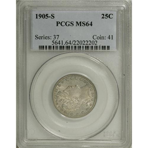 <B>1905-S 25C MS64 PCGS.</B></I> Pastel tan and ice-blue shades alternate across this lustrous and suitably struck near-Gem. A magnificent example of this conditionally rare and underappreciated Barber issue. Population: 21 in 64, 15 finer (1/07).<BR><BR><b>Shipping:</b> Coins & Currency (<a target="_blank" href="http://www.heritageauctions.com/common/shipping.php">view shipping information</a>)