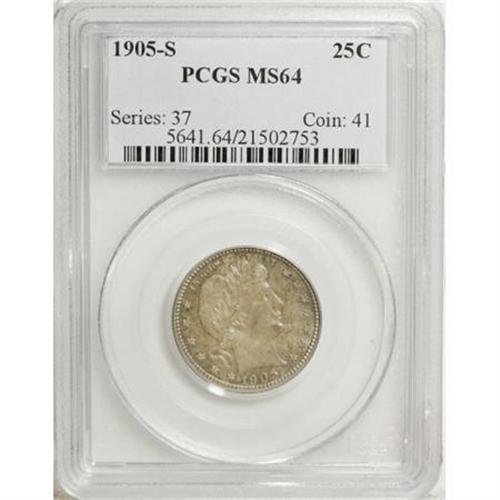 <B>1905-S 25C MS64 PCGS.</B></I> A scarcer S-mint enveloped in olive, brown, and tan color with surfaces that are unquestionably of near-Gem quality. Luster that has been softened by the toning seemingly keeps this piece from the Gem designation. Population: 21 in 64, 15 finer (6/07).<BR><BR><B>Coin Engraver:</B> Charles E. Barber<BR><BR><b>Shipping:</b> Coins & Currency (<a target="_blank" href="http://www.heritageauctions.com/common/shipping.php">view shipping information</a>\)