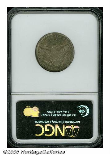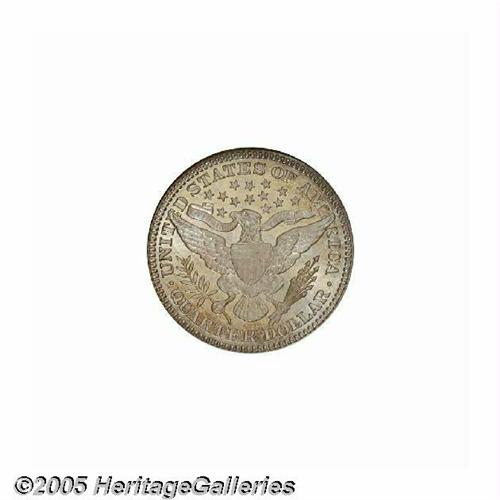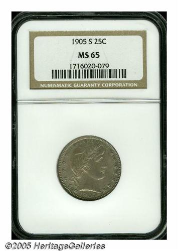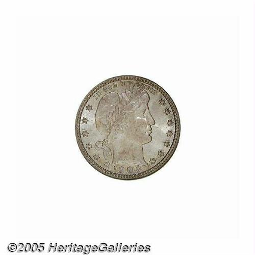 <B>1905-S<25C> MS65 NGC.</B></I> The 1905-S is one of the lesser available S-mint Barber quarters. Only 1.8 million pieces were produced, most of which entered circulation and stayed there. Gems are surprisingly rare with only 13 pieces graded as such by both NGC and PCGS, and 13 specimens grading higher (6/05). This lustrous piece displays light grayish-blue patina with orange-gold and lavender accents, and the design elements are sharply defined throughout. What appears to be a squiggly toning streak extends from Liberty's cheek beneath the nose into the field.