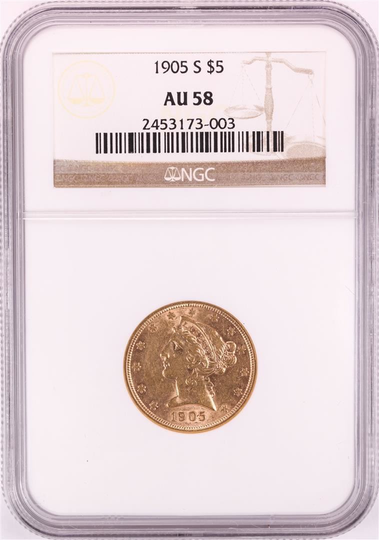 One 1905-S $5 Liberty Head Half Eagle Gold Coin NGC AU58. NGC Certified.