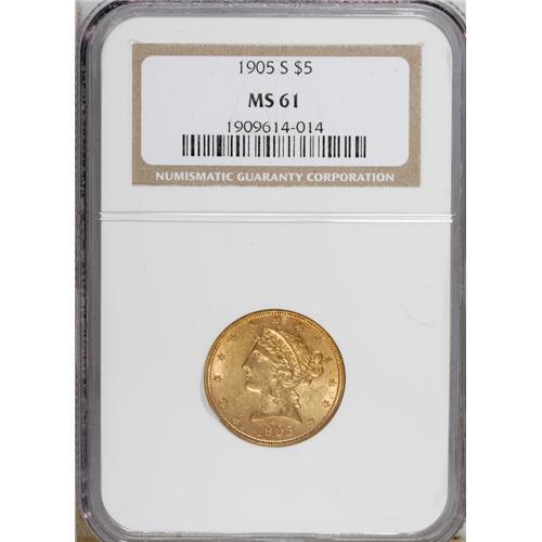 <B>1905-S $5 MS61 NGC.</B></I> NGC Census: (104/71). PCGS Population (36/89). Mintage: 880,700. Numismedia Wsl. Price: $575. (#8412)<BR><BR><b>Shipping:</b> Coins & Currency (<a target="_blank" href="http://www.heritageauctions.com/common/shipping.php">view shipping information</a>)