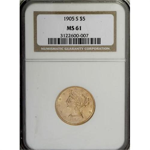 <B>1905-S $5 MS61 NGC.</B></I> . NGC Census: (118/72). PCGS Population (37/99). Mintage: 880,700. Numismedia Wsl. Price for NGC/PCGS coin in MS61: $575. (#8412)<BR><BR><B>Coin Engraver:</B> Christian Gobrecht<BR><BR><b>Shipping:</b> Coins & Currency (<a target="_blank" href="http://www.heritageauctions.com/common/shipping.php">view shipping information</a>)