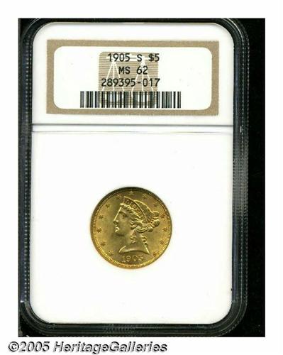1905-S $5 MS62 NGC. Lustrous and pleasing, this l