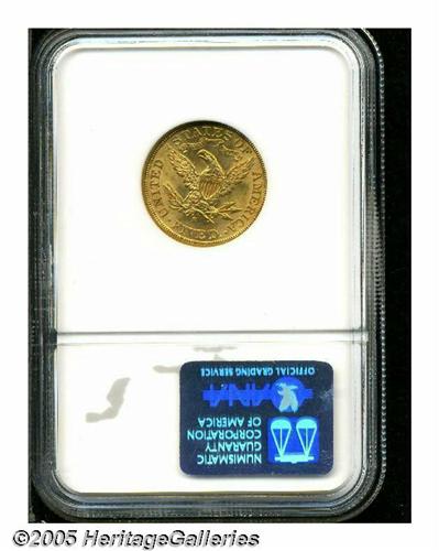 <B>1905-S<$5> MS62 NGC.</B></I> Lustrous and pleasing, this light orange-gold example is kept from a higher grade by a faint pinscratch beneath the eighth star. A better date in Mint State. Population: 32 in 62, 28 finer (5/05).