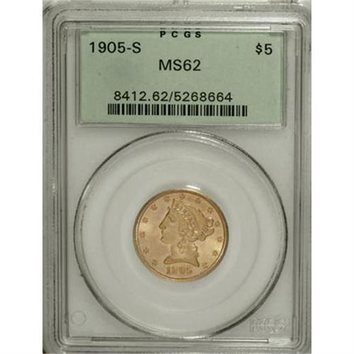 <B>1905-S $5 MS62 PCGS.</B></I> Excellent detail for this San Francisco issue with shining apricot-gold surfaces. Though the fields and devices show a number of wispy abrasions, the visual appeal is strong for the grade assigned. Population: 53 in 62, 43 finer (10/07).<BR><I>From The Parker Lee III Collection.</B></I><BR><BR><B>Coin Engraver:</B> Christian Gobrecht<BR><BR><b>Shipping:</b> Coins & Currency (<a target="_blank" href="http://www.heritageauctions.com/common/shipping.php">view shipping information</a>)