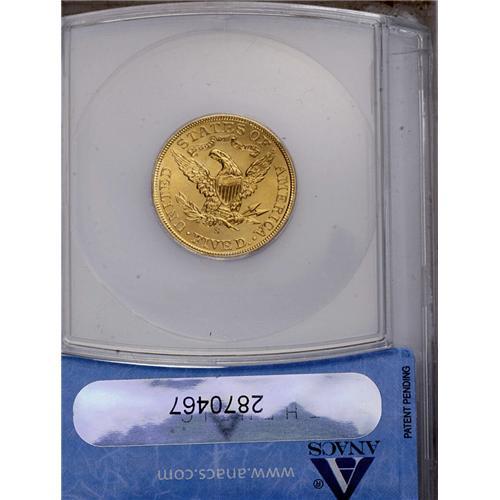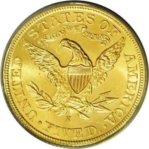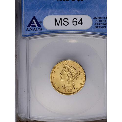 <B>1905-S<$5> MS64 ANACS.</B></I> Satiny apricot-gold surfaces display tinges of subtle light green, and emit glowing, unbroken luster. Powerful impressions characterize the design features, and the surfaces are remarkably clean for the grade, with just a couple of ticks evident on Liberty's face and in the left obverse and reverse fields. Excellent overall eye appeal.