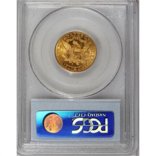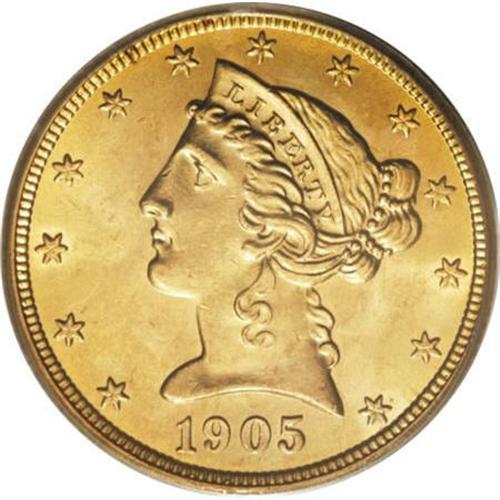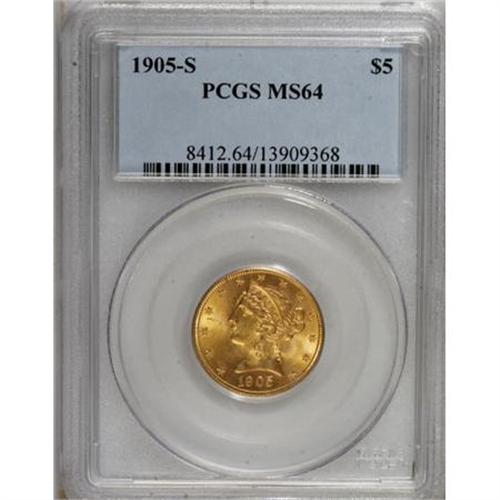 <B>1905-S $5 MS64 PCGS.</B></I> A lovely peach-gold representative that has unexpectedly clean fields, especially on the reverse. Only a hair-thin mark on the jaw denies classification as a full Gem. The 1905-S is significantly scarcer in Mint State than its mintage suggests. Presumably, most of the mintage was released into local circulation, unlike the 1905, which was likely held as bank reserves. Population: 21 in 64, 4 finer (8/07).<BR><BR><B>Coin Engraver:</B> Christian Gobrecht<BR><BR><b>Shipping:</b> Coins & Currency (<a target="_blank" href="http://www.heritageauctions.com/common/shipping.php">view shipping information</a>)