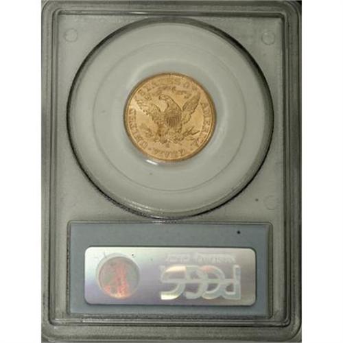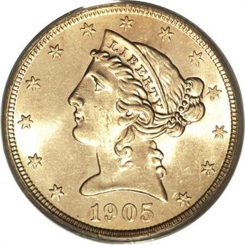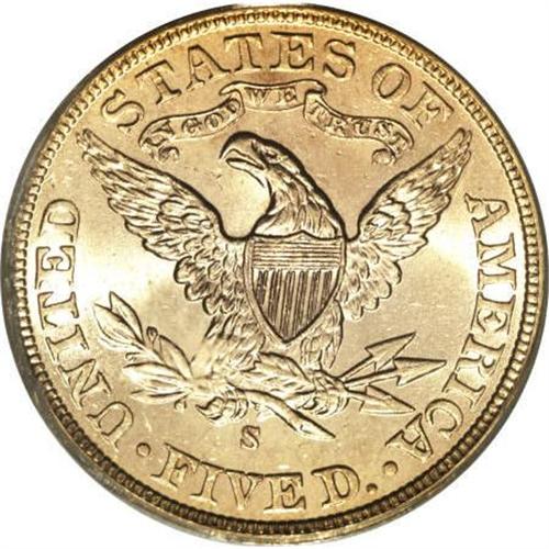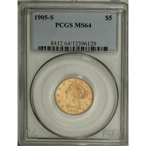 <B>1905-S $5 MS64 PCGS.</B></I> Most of the production of the 1905-S was apparently released into West Coast circulation, since the issue is scarce in Mint State and a rarity at the MS64 level. This crisply struck and lustrous yellow-gold example is only separated by occasional hair-thin grazes from status as a full-fledged Gem. Population: 22 in 64, 4 finer (3/08).<BR><BR><B>Coin Engraver:</B> Christian Gobrecht<BR><BR><b>Shipping:</b> Coins & Currency (<a target="_blank" href="http://www.heritageauctions.com/common/shipping.php">view shipping information</a>)