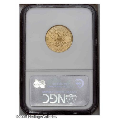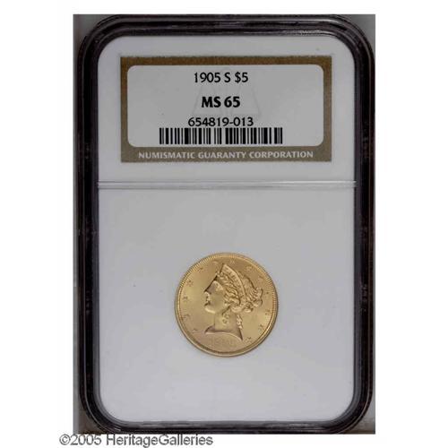 <B>1905-S<$5> MS65 NGC.</B></I> This is a surprisingly rare coin in Gem quality, a true condition rarity. Although 880,700 of these coins were originally minted, just eight examples have been graded MS65 or finer by PCGS and NGC combined! This equates to one Gem for every 110,000 originally struck, and that assumes no resubmissions. Sharply struck with full design definition on both sides. On the obverse, all of the hair curls and strands are complete, and every star has full central radials. Only star 10 shows even the slightest weakness. The reverse is similarly sharp, with all individual features of the eagle fully brought up, even including the claws. This Gem is fully lustrous with satiny orange-gold surfaces. The medium S mintmark is high in the field, close to the tip of the arrow feather, and centered over the V. A remarkable Gem for the connoisseur. Census: 3 in 65, 1 finer (11/05).