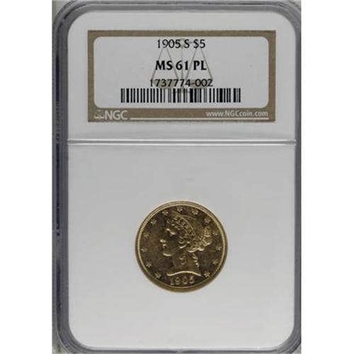 <B>1905-S $5 MS61 Prooflike NGC.</B></I> NGC Census: (1/0). PCGS Population (0/0). Mintage: 880,700. (#78412)<BR><BR><B>Coin Engraver:</B> Christian Gobrecht<BR><BR><b>Shipping:</b> Coins & Currency (<a target="_blank" href="http://www.heritageauctions.com/common/shipping.php">view shipping information</a>)
