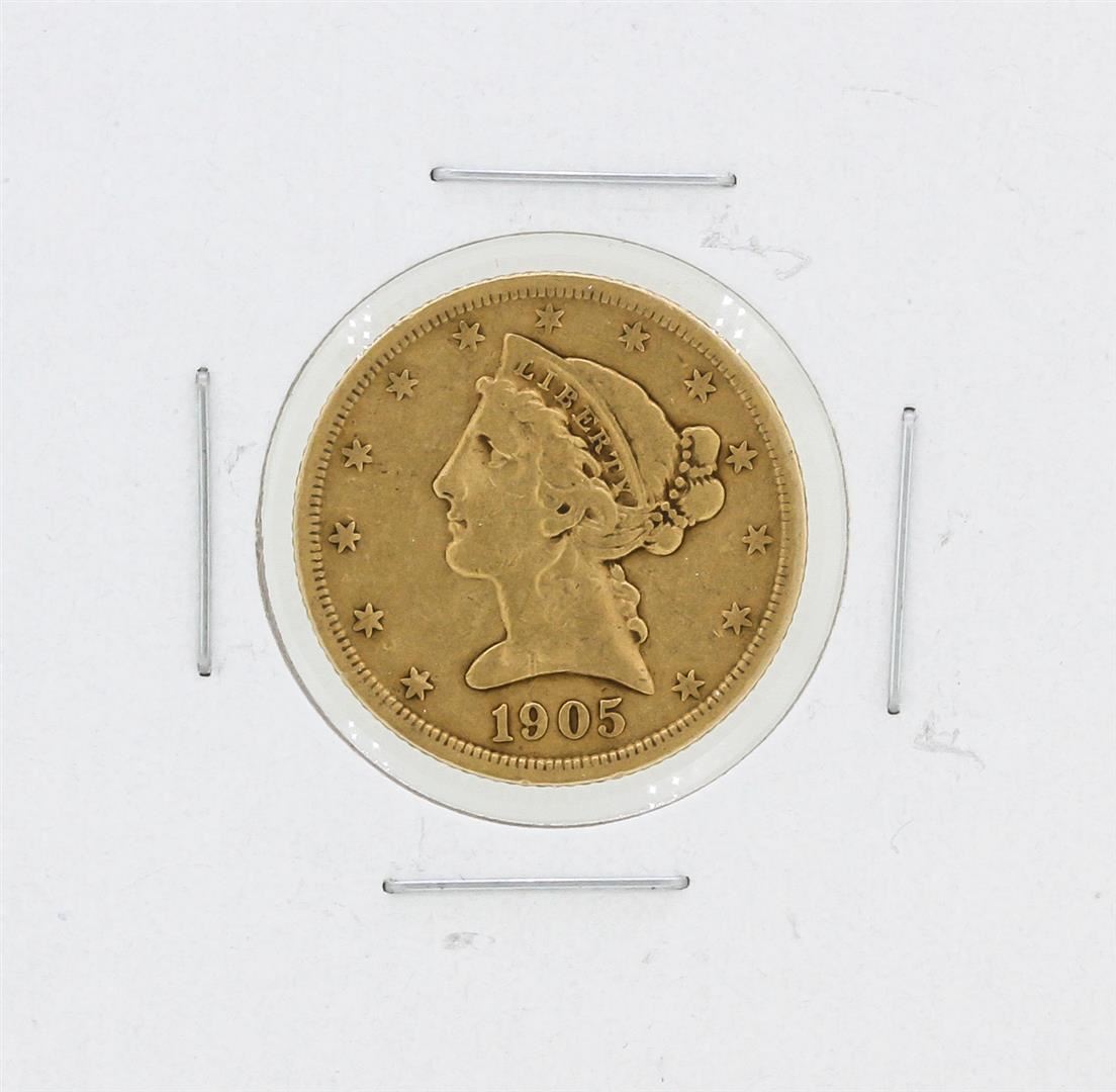 One 1905-S $5 VF Liberty Head Half Eagle Gold Coin.