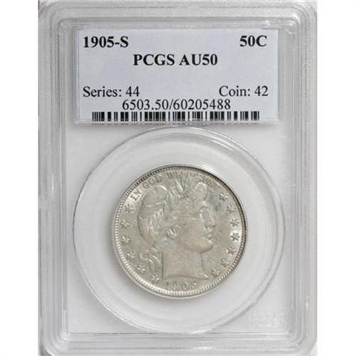 <B>1905-S 50C AU50 PCGS.</B></I> Despite light wear across the devices, the rose-tinged silver-gray fields retain immense luster. A well struck example with a handful of small abrasions on and near the portrait. Population: 7 in 50, 67 finer (3/08).<BR><BR><B>Coin Engraver:</B> Charles E. Barber<BR><BR><b>Shipping:</b> Coins & Currency (<a target="_blank" href="http://www.heritageauctions.com/common/shipping.php">view shipping information</a>)