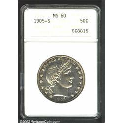 1905-S 50C MS60 ANACS. Lightly speckled with tobacco-brown patina. A nicely struck and somewhat prooflike example that has a few wispy abrasions on each side. A scarce issue than the mintage would suggest.From the Ohio Collection. Important notice: We expect to be auctioning lots at the rate of 200-250 per hour. Sometimes eBay Premier live bid software cannot keep up with that pace, so we strongly recommend that you place a realistic proxy bid now as insurance to avoid disappointment. Also please note that all Heritage/CAA lots purchased through eBay Premier carry a 20% Buyer's Premium. Please make sure you read the Terms and Conditions.