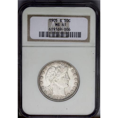 <B>1905-S<50C> MS61 NGC.</B></I> Rich pearl-gray and russet toning confirms the originality of this gently shimmering and suitably struck better date Barber half. Moderate marks near the cheekbone and star 9 limit the grade. Census: 6 in 61, 39 finer (3/06). <BR><BR><B>Important notice:</B> Heritage usually auctions material at the rate of 200-250 lots per hour. On some occasions eBay Live bid software or the Internet may not be able to keep up with the pace of the auction. We recommend placing a realistic absentee bid now as insurance to avoid disappointment. Occasionally the auctioneer may eliminate or reject an eBay Live bid, and the auctioneer may also reopen a lot after the close of the eBay live bidding (usually because we missed an audience bid), and may reject your bid even if it shows you as the winning bidder. By bidding via eBay Live, you agree that Heritage may award the lot to another bidder at its sole discretion under the circumstances described above or any other reasonable circumstances. Since eBay bids are not shown to us until we open the lot on the floor, we treat those bids just like floor bids. In most cases the floor responds before the eBay bid is presented to us, due to Internet lag time, so for consistency we have made it a policy that floor bids are always considered first over tie eBay live bids. Also please note that all Heritage lots purchased through eBay Live carry a 20% Buyer's Premium. Please make sure you read the Terms and Conditions before you bid. This lot is being auctioned in conjunction with a live floor auction by Heritage Galleries & Auctioneers. All final auction and invoice information will be supplied by Heritage Galleries & Auctioneers, and all other information should be considered preliminary. Lot:2061 <BR><BR><B>Winning Notification and Billing:</B> After the FINAL session in this auction is complete, Heritage will send e-mail and snail mail invoices. This process normally takes several days. All final auction and invoice information will be supplied by Heritage Galleries & Auctioneers, and all other information should be considered preliminary. <BR><BR>This auction will be conducted on a live auction floor and over the Internet through eBay Live. If you choose to place an absentee bid, please take a moment to <font color='#0000ff'><u><a href='http://pages.ebay.com/liveauctions/help/before/laabsentee.html'>learn how eBay Live absentee bidding works</a></u></font><font color='#000000'>