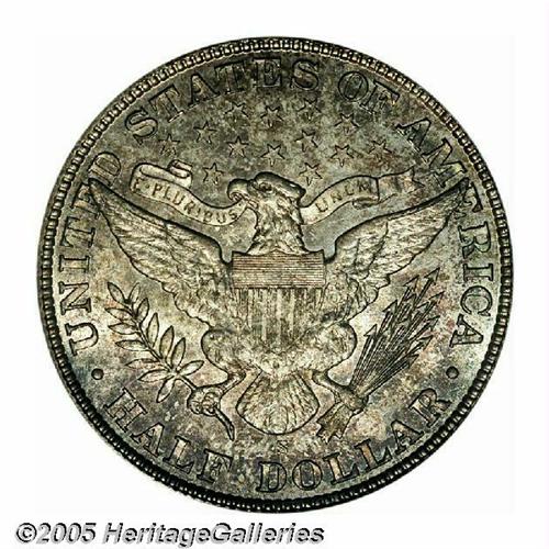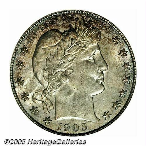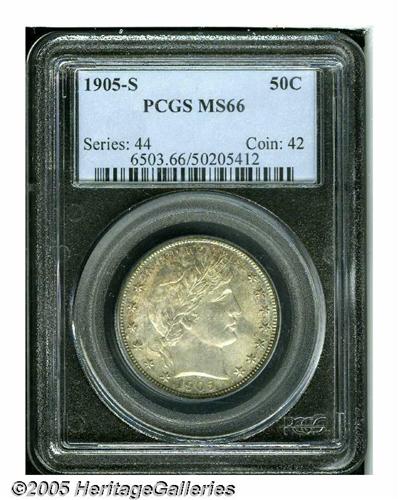 <B>1905-S<50C> MS66 PCGS.</B></I> According to current population data, only two coins have received a higher grade from PCGS, and those coins (or that coin?) could only be marginally finer than this. Were it not for a miniscule chatter mark on Liberty's cheek, we would fully expect this coin to be in a MS67 holder. The surfaces have satiny luster with ivory color accented by peripheral golden-brown and pale blue toning. This issue is a condition rarity, like so many others in the Barber series. In all grades, PCGS has certified 81 examples of the date, yet only 11 of those qualified as Gems. Population: 3 in 66, 2 finer (5/05).