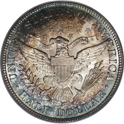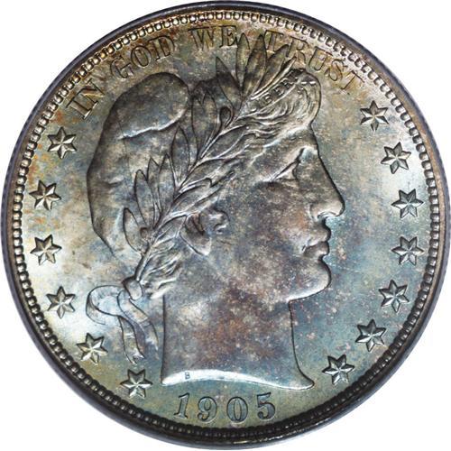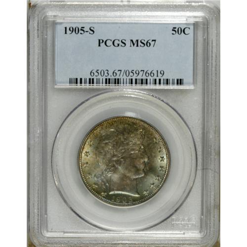 <B>1905-S 50C MS67 PCGS.</B></I> An exciting example that is tied for the finest certified, this Superb Gem possesses superlative russet, gold, and sea-green toning that is intermingled across the obverse surface and concentric on the reverse. All of the design elements are boldly detailed and the surfaces are pristine. Although this date hides in the shadows of the 1904-S rarity, it is elusive in Gem grades and quite possibly underrated at the highest grade levels. Just 12 examples of the 1905-S Barber half dollar have been certified as Gem quality pieces by PCGS. Population: 3 in 67, 0 finer (1/07).<BR><BR><b>Shipping:</b> Coins & Currency (<a target="_blank" href="http://www.heritageauctions.com/common/shipping.php">view shipping information</a>)