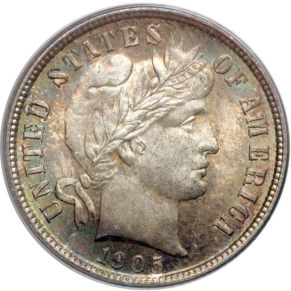 1905-S. PCGS graded MS-64+. CAC Approved. Lovely rainbow toning. Pop 2; 30 finer, 18 in 65, 9 in 66, 3 in 67 (PCGS # 4837) .