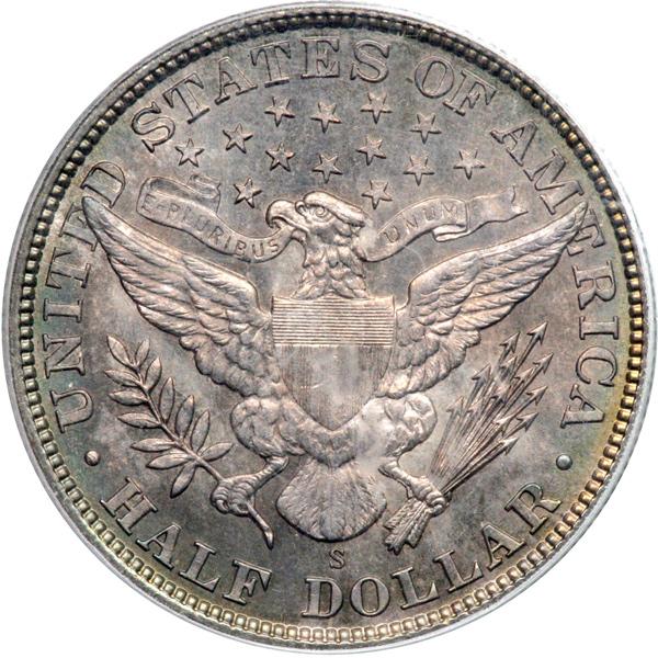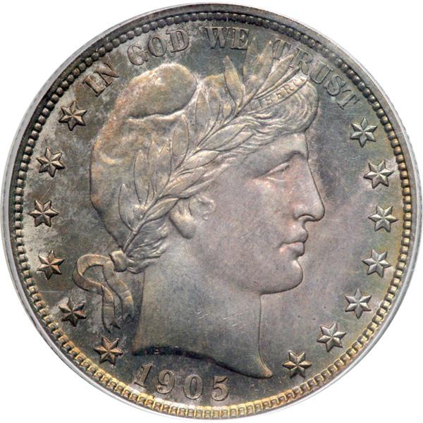 1905-S Barber Half Dollar. PCGS graded MS-66. Lovely multicolor toning on both sides. Boldly struck. The surfaces have smooth luster under the accents of color. This issue is a condition rarity, like so many others in the Barber series. Although this issue is often overshadowed by the 1904-S, it is also very elusive at the higher Mint State grade levels. We rarely see 1905-S halves qualified as Gem MS66. Pop 3; 3 finer in 67 (PCGS # 6503) .