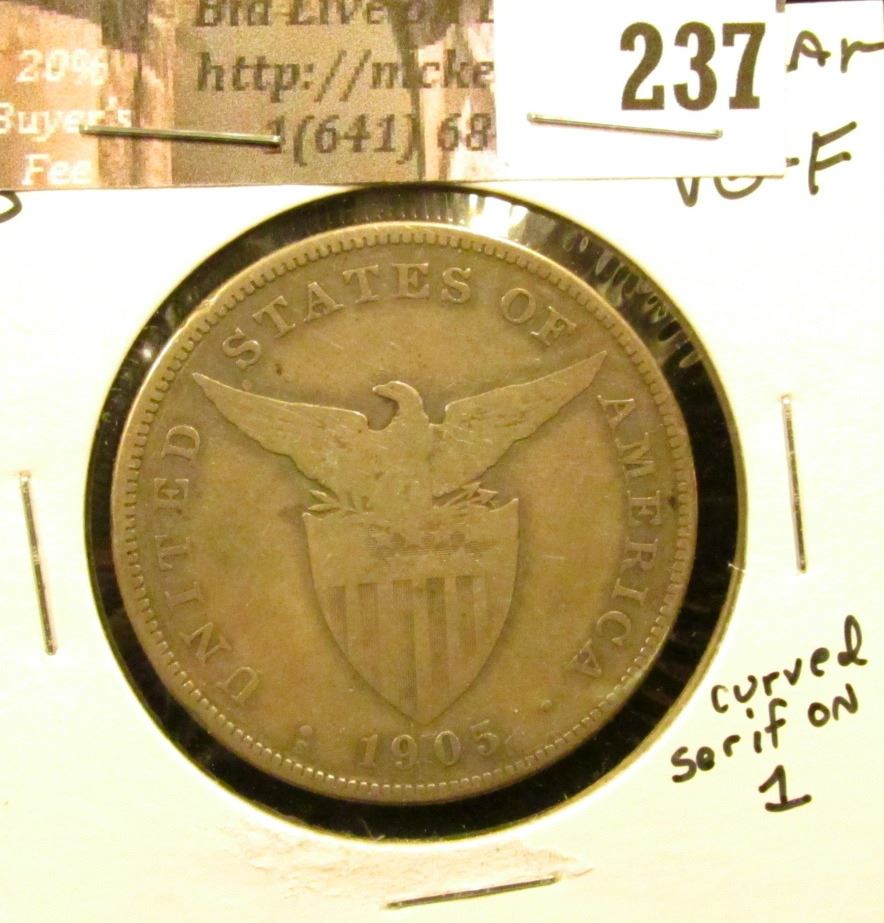 1905 S Philippines-U.S. Dollar, curved serif on "1", VG-Fine.
