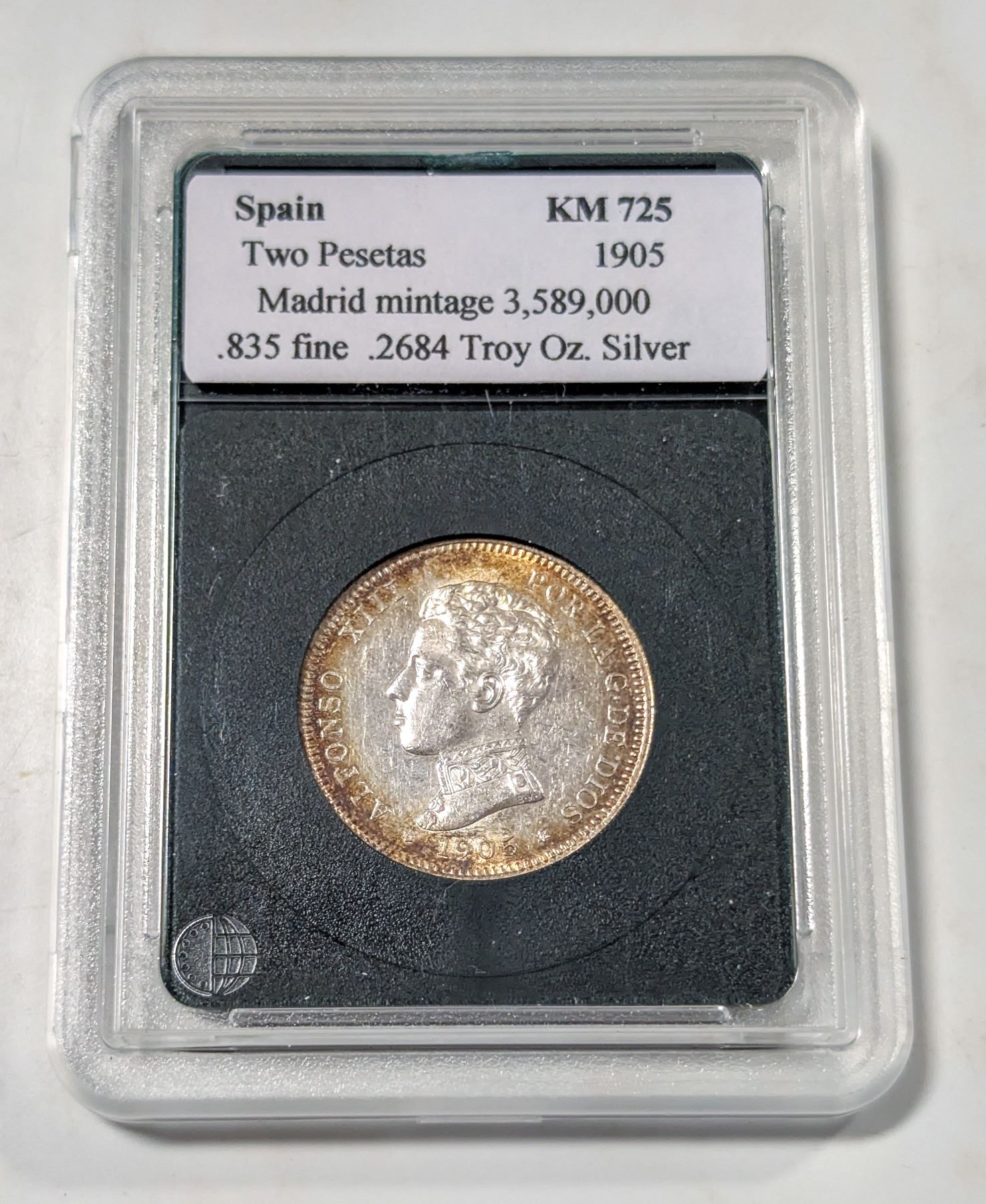 1905 SPAIN 2 PESETAS SILVER COIN 835 SILVER