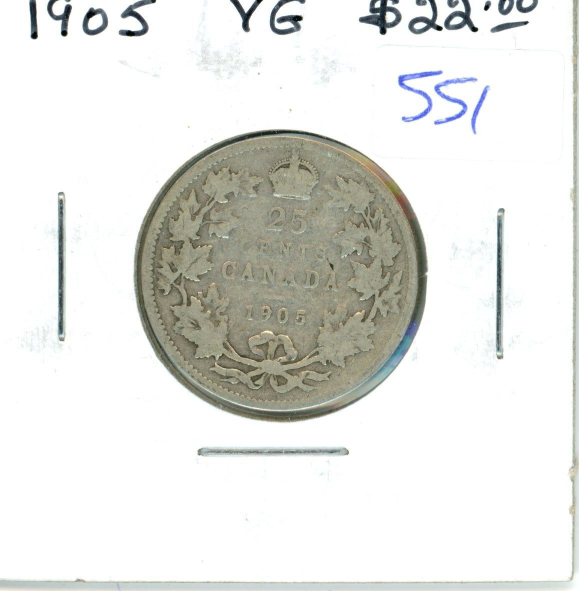 1905 Silver 25 Cents. Key Date. Mintage of 800,000. VG-8.