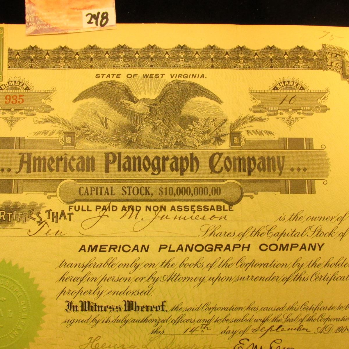 1905 Stock Certificate for 10 Shares of "…American Planograph Company Capital Stock", upper central vignette of American Bald Eagle With shield and staff with Liberty cap, (2) State of New York Stock transfer stamps attached. 'Doc' valued this certificate at $75.00.