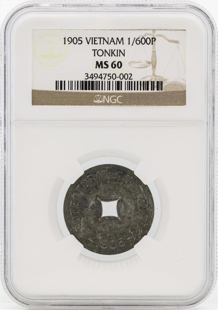 One 1905 Vietnam Tonkin 1/600 Piastre Coin NGC MS60. NGC Certified.