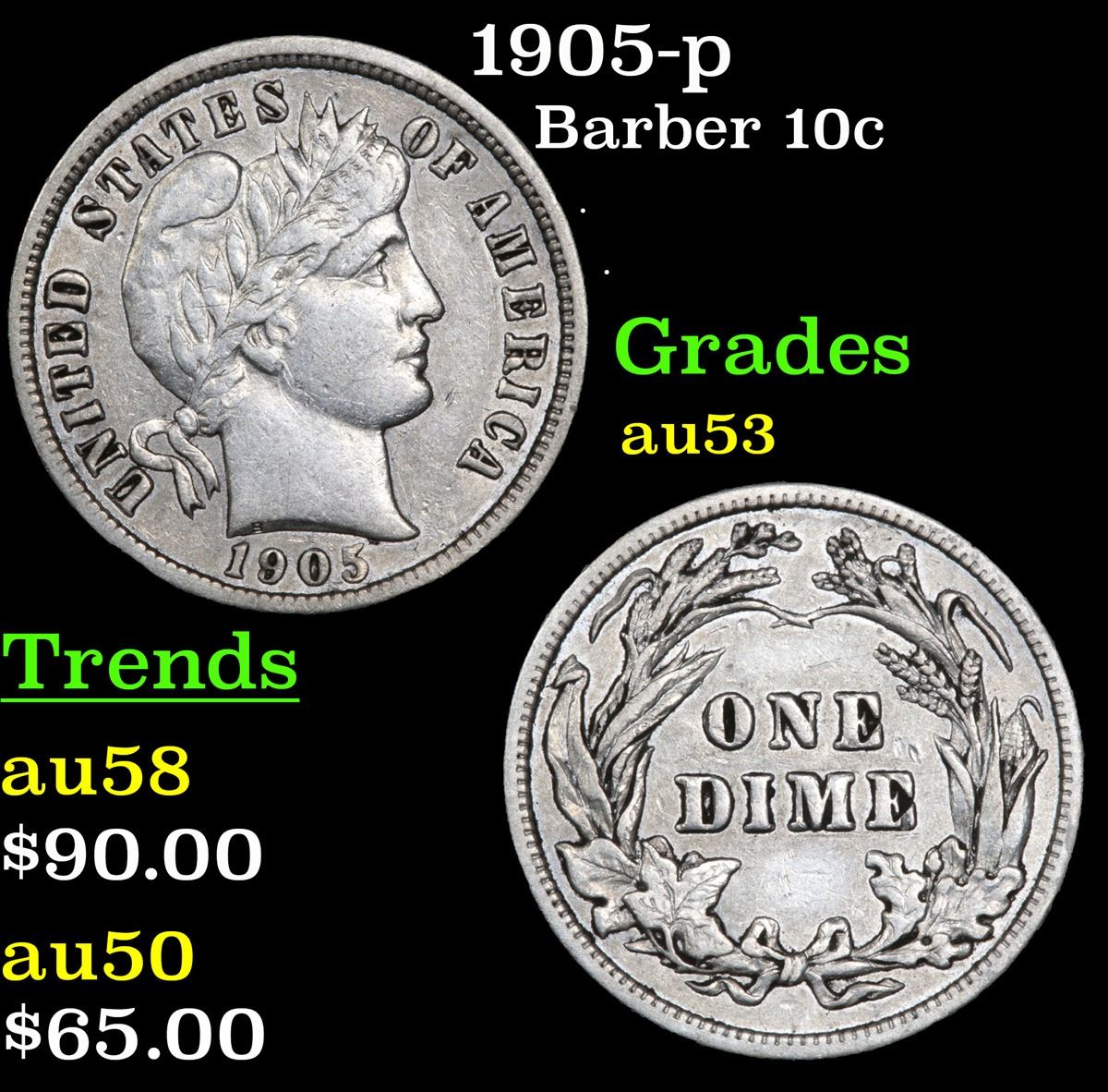 1905-p . . Barber Dime 10c Grades Select AU.