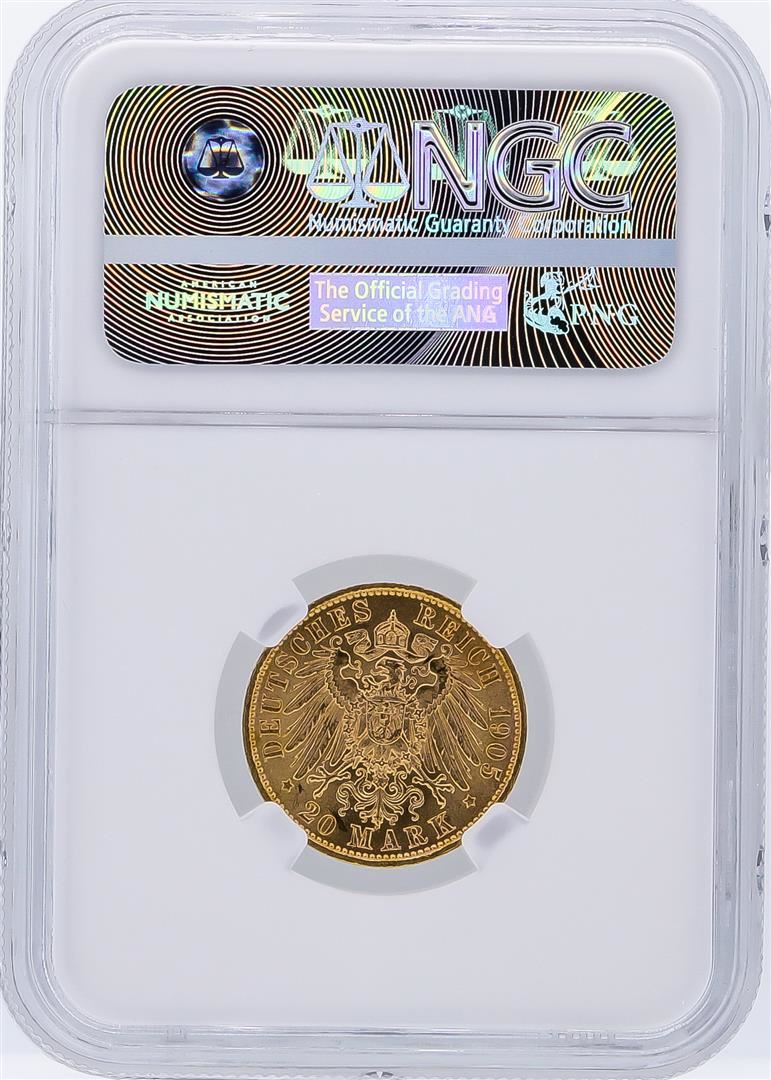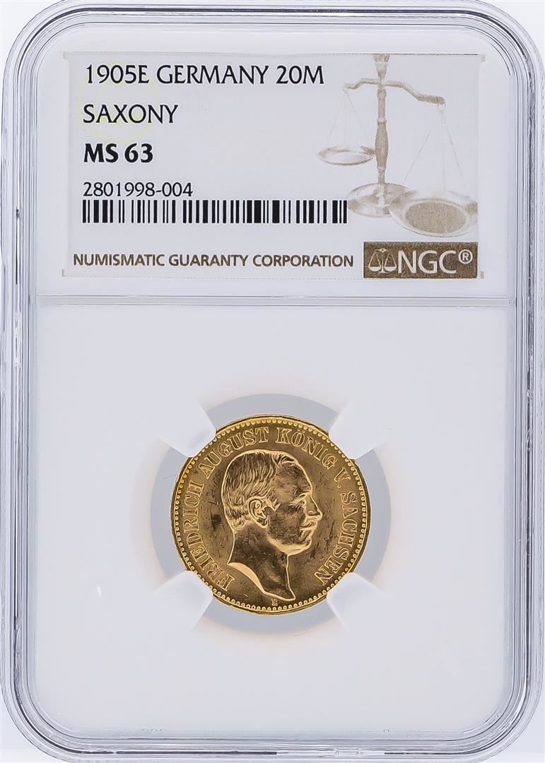 One 1905E NGC MS63 Germany 20M Saxony Gold Coin. NGC Certified.