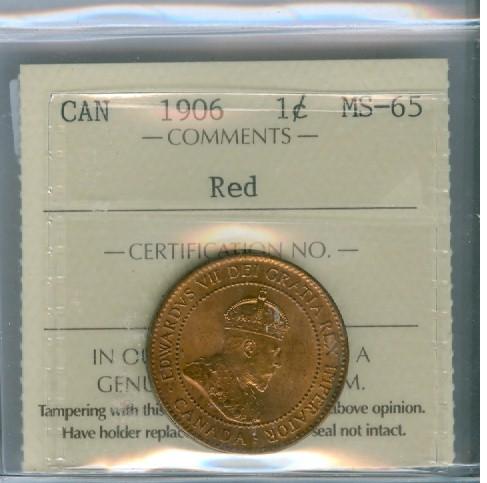1906 1¢ ICCS MS65 Red, attactive and fully lustrous 90% red. Tied for finest, underrated coin in Gem!