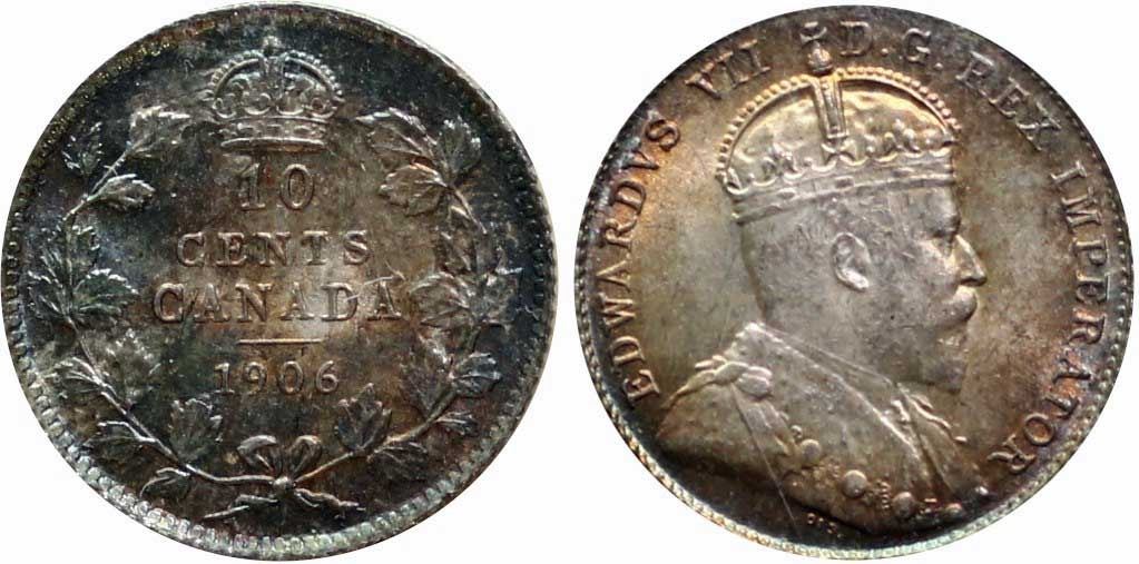 1906 10¢ ICCS Gem Mint State-65. Light blue, green and golden tones over full underlying lustre with particular smooth and clean fields. A highly attractive and beautiful example to add to the best of collections.
