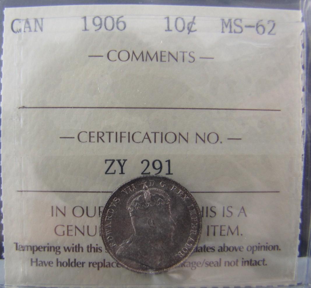 1906 10¢ ICCS MS62. Nice issue with lots of lustre.