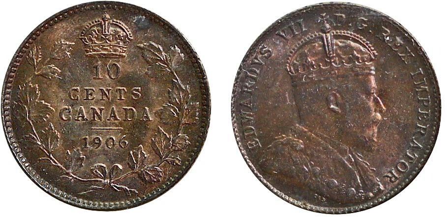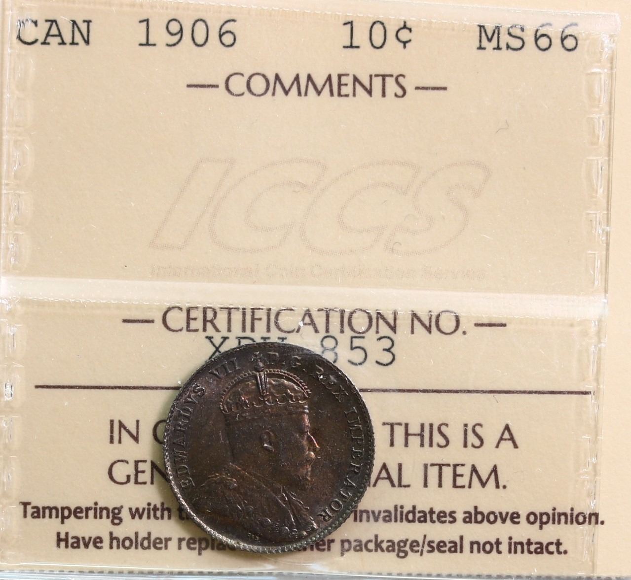 1906 10¢ ICCS Superb Gem Mint State-66. Great lustre with spectacular colours. An amazing example.