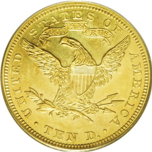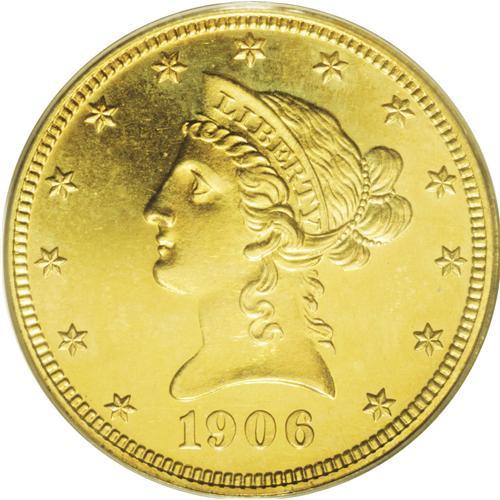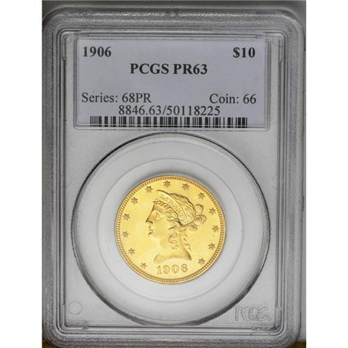 <B>1906<$10> PR63 PCGS.</B></I> The Philadelphia Mint produced a limited quantity of 77 proof eagles in 1906. It is not known today if they were all distributed, or if some were melted after remaining unsold within the Mint. Some numismatists theorize that probably only about half of the original delivery survives today. This is a pleasing Proof with sharp design features as expected. The fields are deeply reflective, and a hint of frost appears on the devices. All of this is accented by magnificent orange-gold coloration with some milky hues in the fields. Some scattered hairlines in the fields serve to limit the grade.<BR><I>From The Jackson Hole Collection.</B></I>