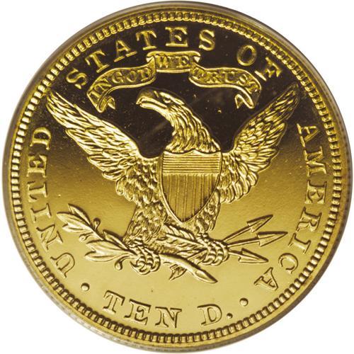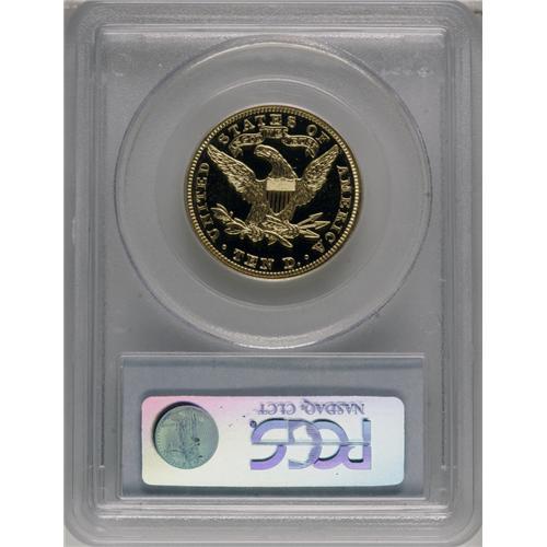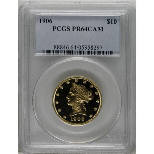 <B>1906 $10 PR64 Cameo PCGS.</B></I> A tiny die lump (as made) on the central right portion of the 9 in the date is diagnostic for this desirable proof issue, of which only 77 specimens were produced. This near-Gem exhibits profound gold-on-black contrast between the watery, jet-black mirrored fields and the radiant, frosted devices. A noticeable patch of wispy die polish lines resides on Liberty's jaw and neck, and a tiny mark is located just above. Two or three equally minute marks, probably planchet flaws, are noted on the reverse fields with the aid of a magnifier.<BR><BR><b>Shipping:</b> Coins & Currency (<a target="_blank" href="http://www.heritageauctions.com/common/shipping.php">view shipping information</a>)