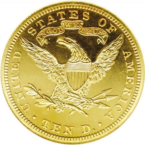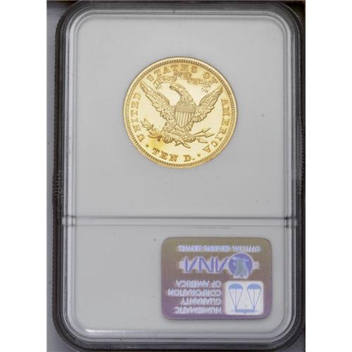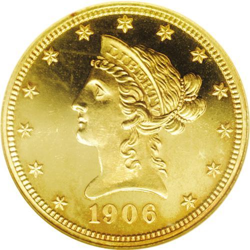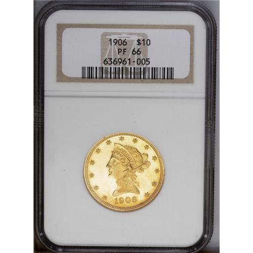 <B>1906<$10> PR66 NGC.</B></I> A remarkable Gem proof with rich green and orange-gold color accented by splashes of deeper rose toning, especially at the lower obverse. According to Mint records, 77 proof eagles were struck in 1906, and possibly half that number survive today. Quite a number of these have appeared in auction over the past couple decades, and due to similarity of photos in the older catalogs, an exact pedigree record is currently not available. Identification should not be impossible, however, for a prominent planchet flake joins the right base of T in TEN. This example is the single finest non-cameo specimen examined by NGC.<BR><I>From The Larj Collection.</B></I> Census: 1 in 66, 0 finer (1/06).