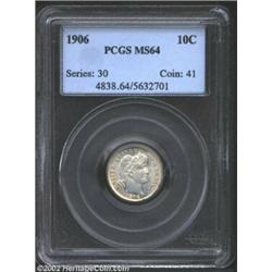1906 10C MS64 PCGS. The otherwise silver-gray surfaces reveal pale steel-gray and golden iridescence in select peripheral areas. A frosty and generally distraction-free representative for the near-Gem type collector.From the Ronald Bozarth Collection. Important notice: We expect to be auctioning lots at the rate of 200-250 per hour. Sometimes eBay Premier live bid software cannot keep up with that pace, so we strongly recommend that you place a realistic proxy bid now as insurance to avoid disappointment. Also please note that all Heritage/CAA lots purchased through eBay Premier carry a 20% Buyer's Premium. Please make sure you read the Terms and Conditions.