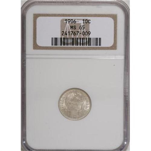 <B>1906 10C MS65 NGC.</B></I> A lustrous and razor-sharp Gem that offers wonderful preservation and subtle sea-green tints over otherwise silver-white surfaces. Despite the 1906's reputation as a common issue, MS65 and better pieces are elusive. Census: 43 in 65, 8 finer (1/08).<BR><I>From The Southwest Collection.</B></I><BR><BR><B>Coin Engraver:</B> Charles E. Barber<BR><BR><b>Shipping:</b> Coins & Currency (<a target="_blank" href="http://www.heritageauctions.com/common/shipping.php">view shipping information</a>)