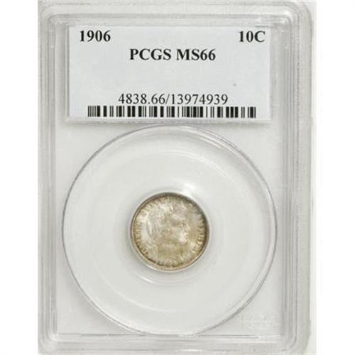 <B>1906 10C MS66 PCGS.</B></I> Frosty and softly lustrous, amazingly well-preserved after more than a century. Rich reddish-orange patina graces the peripheries of this pleasing P-mint piece. Population: 12 in 66, 5 finer (8/07).<BR><BR><B>Coin Engraver:</B> Charles E. Barber<BR><BR><b>Shipping:</b> Coins & Currency (<a target="_blank" href="http://www.heritageauctions.com/common/shipping.php">view shipping information</a>)