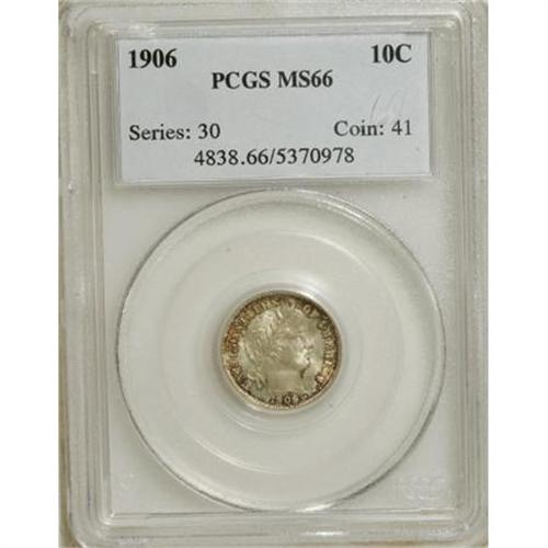 <B>1906 10C MS66 PCGS.</B></I> Peripheral reddish-brown and apple-green patina graces the lustrous, carefully preserved surfaces. Boldly struck throughout with undeniable eye appeal. Population: 12 in 66, 5 finer (3/08).<BR><BR><B>Coin Engraver:</B> Charles E. Barber<BR><BR><b>Shipping:</b> Coins & Currency (<a target="_blank" href="http://www.heritageauctions.com/common/shipping.php">view shipping information</a>)
