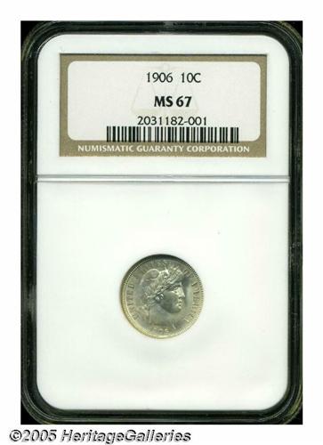 <B>1906<10C> MS67 NGC.</B></I> Unquestionably original and immensely appealing with a thin layer of basic, light silver-gray patina. Both sides exhibit a bold strike, and there are no mentionable flaws or other surface distractions. A perfect chance to own a Superb quality type coin. Population: 4 in 67, 0 finer (4/05).