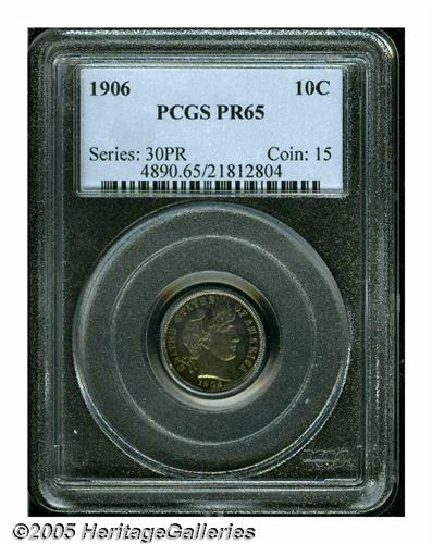 <B>1906<10C> PR65 PCGS.</B></I> Mottled violet-gold, green and yellow coat the surfaces of this Gem proof. The underlying luster is quite good, and the piece has great overall eye appeal.