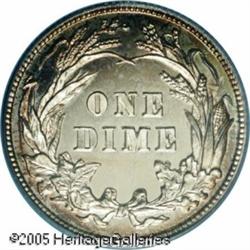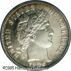 <B>1906 10C  PR66 Cameo PCGS.</B></I> Only 675 dime proofs were minted in 1906. The specimen we offer here is one of the three finest certified by PCGS (1/05). Deep, watery fields flash forcefully at the viewer with noticeable mint frost over the devices, thereby establishing stunning field-motif contrast. The peripheries are attractively toned in pale aquamarine and golden-brown shades, which frame the essentially untoned centers. Crisp impressions prevail on the design features, and the pristine surfaces have been lovingly preserved. Population: 3 in 66, 0 finer (1/05).<BR><I>From the Bruce Scher #1 All-Time PCGS Registry Set.</B></I>   Lot:4066